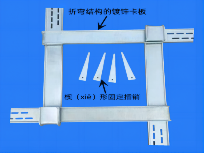方柱扣由4個一端為折彎結構的鍍鋅卡板+4個楔(xiē)形固定插銷組成;且每條卡板上沿其長度方向設置有若干個間隔相同的固定孔,固定銷穿過固定孔和面孔將卡板與限位套固定,從而形成安裝拆卸方便的加固模板(如下圖)。