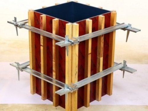 方柱扣加固件的組成。方柱的鋼筋是由4塊鋼板和4塊鐵楔組成。每個(gè)卡板的一端是u形彎頭,另一端滿是兩排準(zhǔn)確尺寸的方孔。四塊鋼卡板通過(guò)肘部的交互鏈接固定在方柱模板周?chē)⑺膲K楔形的鐵塊壓入夾板末端的方孔中,以擰緊模板。