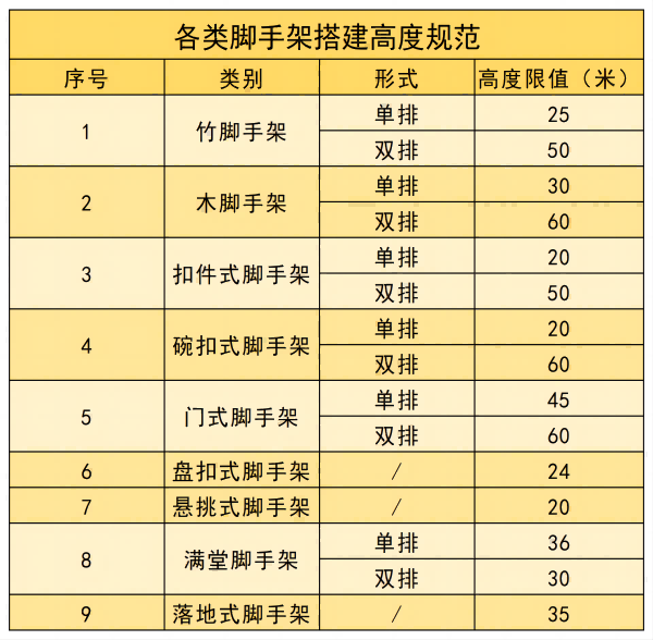 搭建高度的規(guī)范,不同的腳手架適用于不同的情景,希望大家都可以適用合適的腳手架進(jìn)行建筑施工或搭設(shè)使用,如果您有其他關(guān)于腳手架搭建的疑問,歡迎咨詢